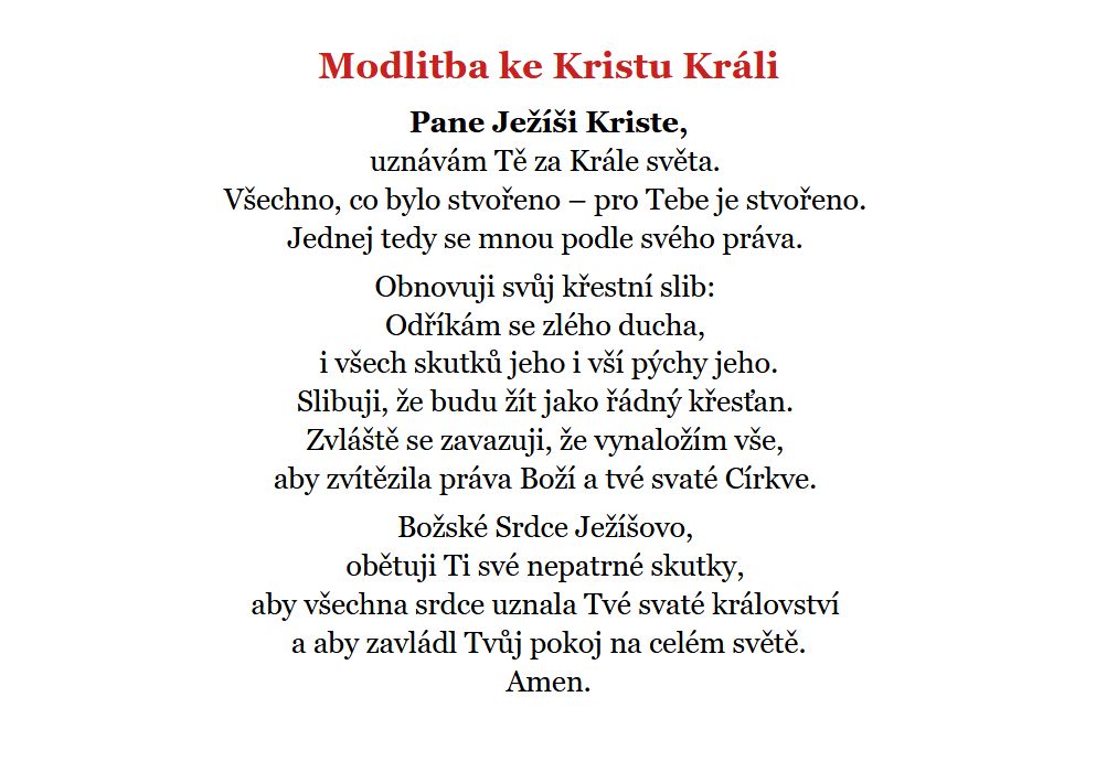 Ať se dnes projeví sláva a moc tvé Krve. Přijímám vše, co mi dnes sešleš, ke slávě tvé Krve, užitku svaté Církve a na zadostiučinění za své hříchy.